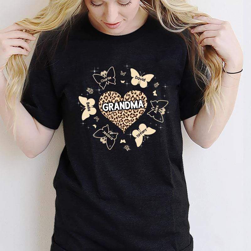 Grandma Mom Heart Butterfly Around Leopard Personalized Shirt