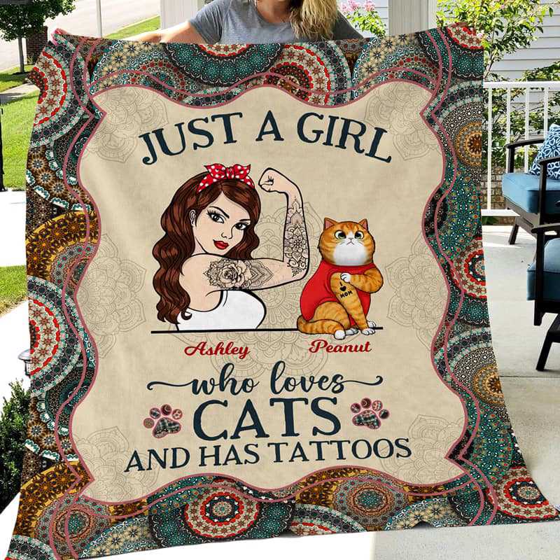 Woman Loves Cats And Tattoo Mandala Personalized Fleece Blanket